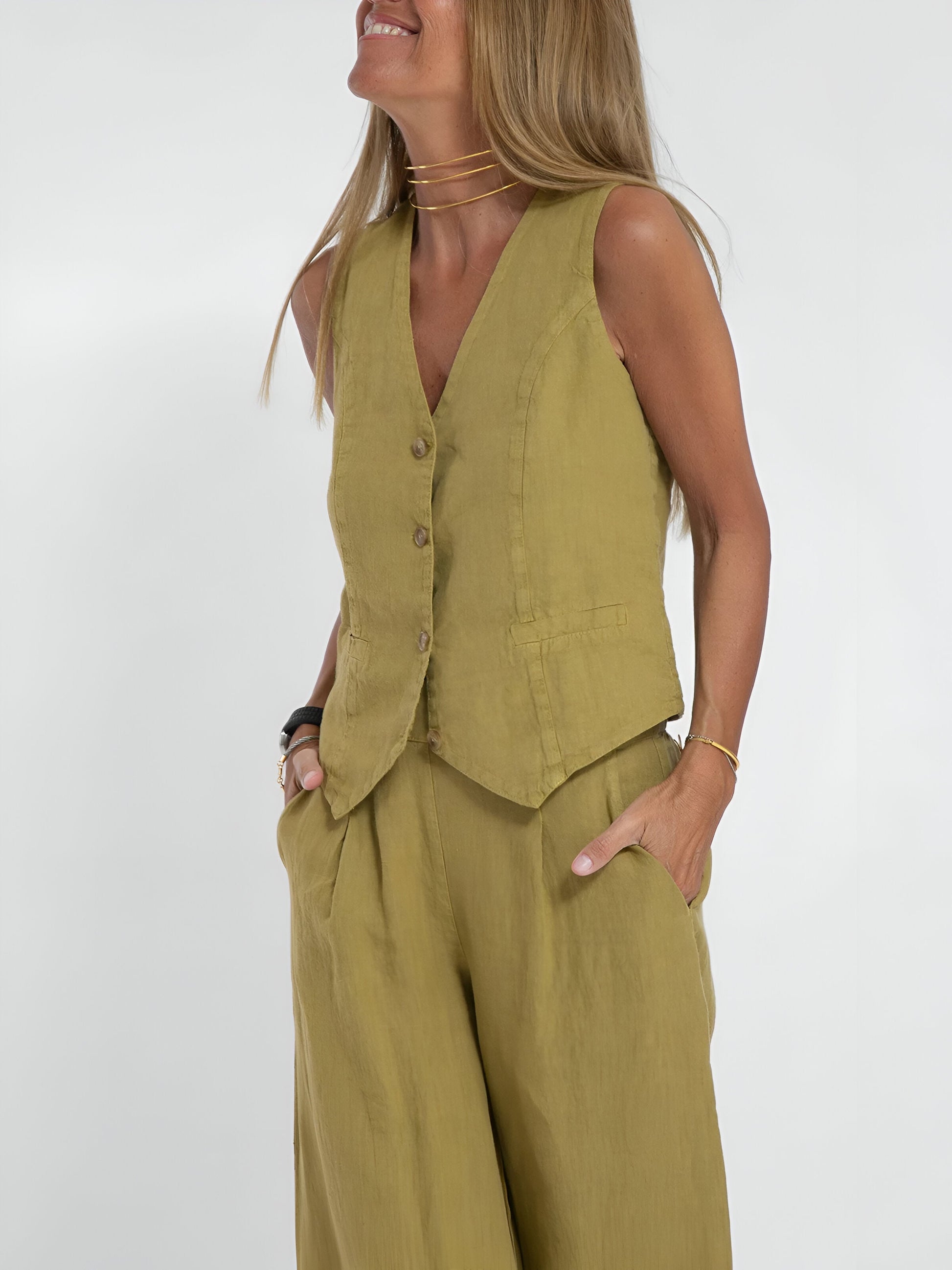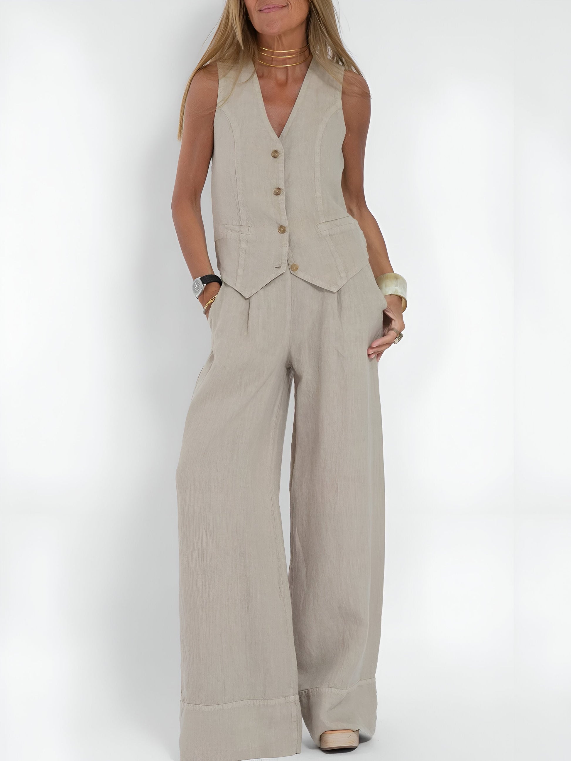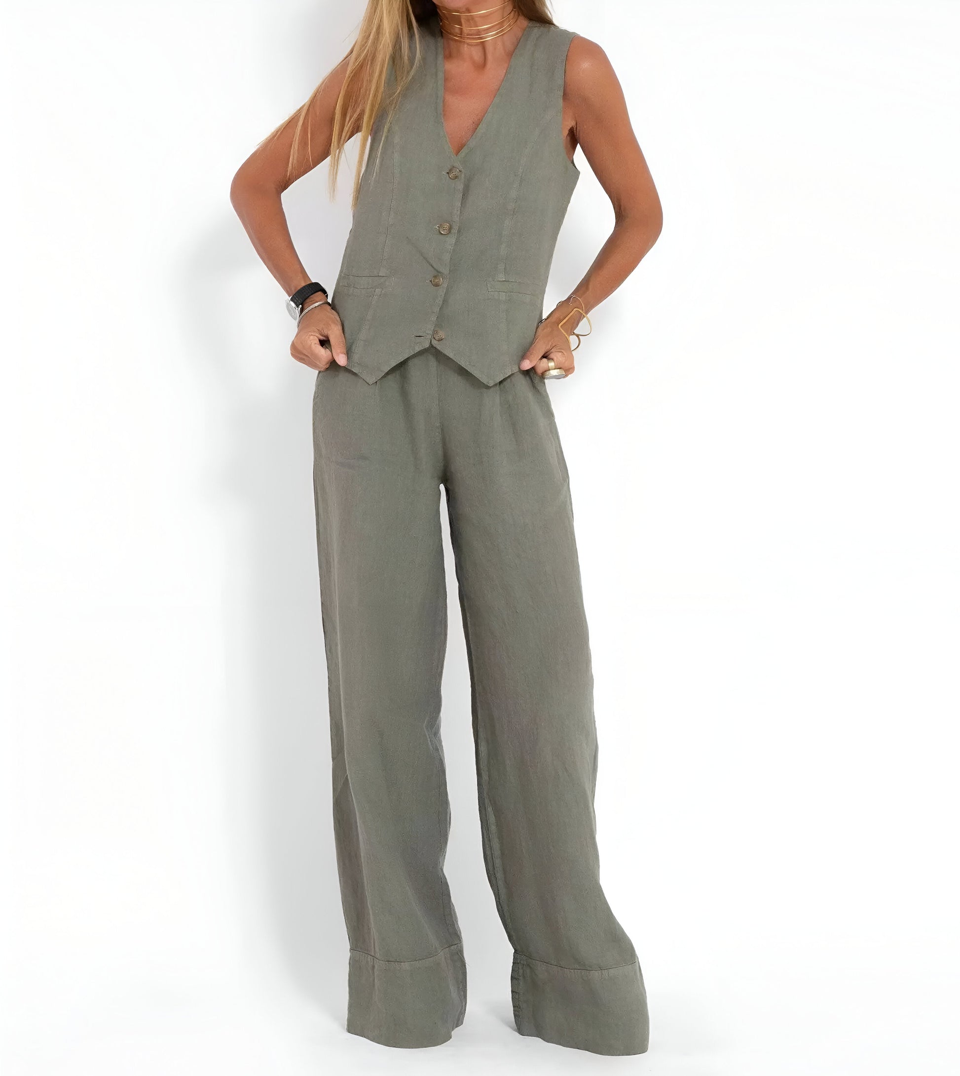 De Valeria linnen set is het toonbeeld van moeiteloze luxe. Met zijn luchtige linnen stof en elegante snit straalt deze set verfijning uit, terwijl hij tegelijkertijd ultiem comfort biedt. Perfect voor zomerse dagen, stijlvolle avonden en alles daartussenin.