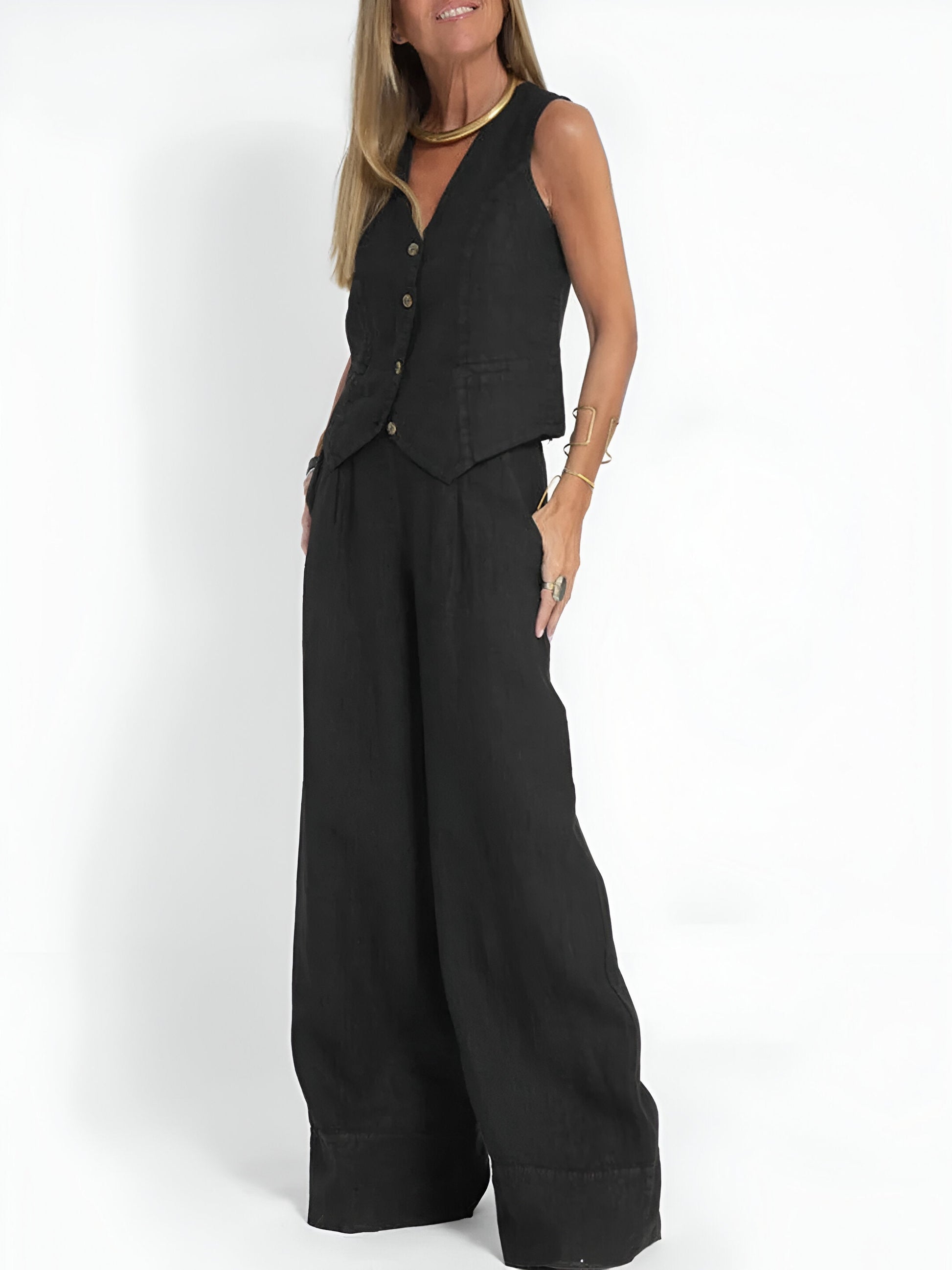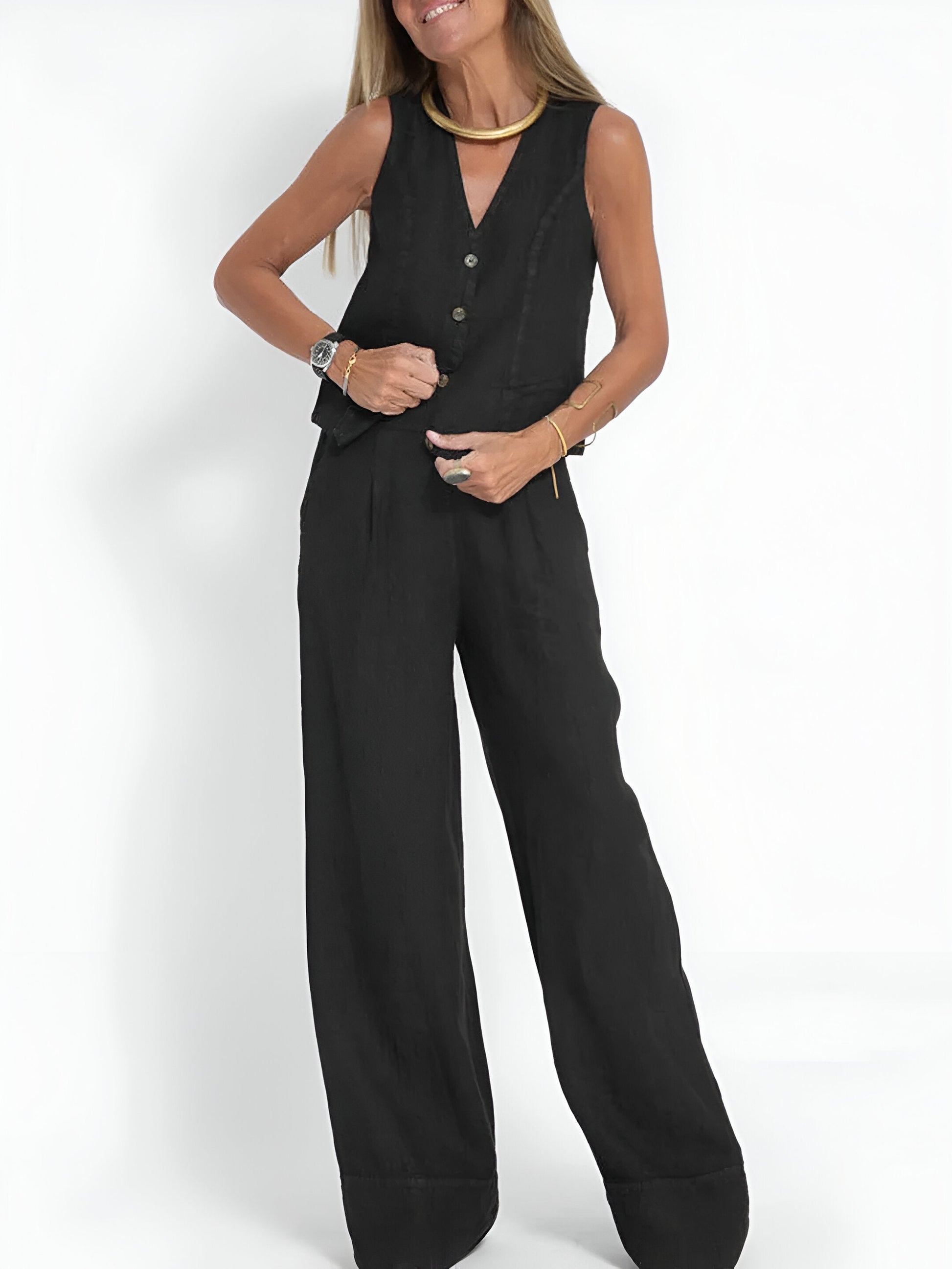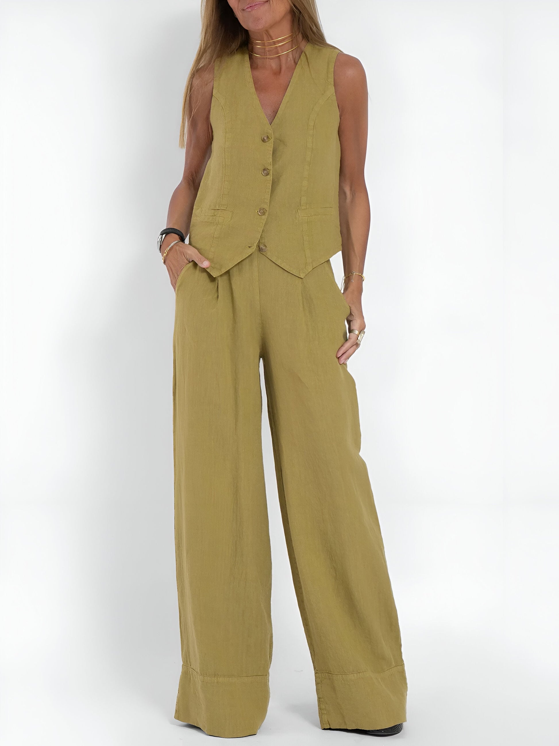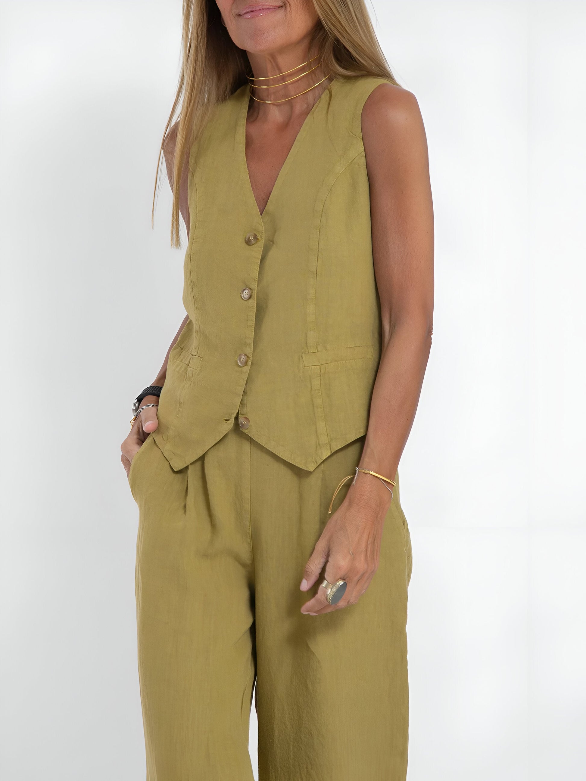 De Valeria linnen set is het toonbeeld van moeiteloze luxe. Met zijn luchtige linnen stof en elegante snit straalt deze set verfijning uit, terwijl hij tegelijkertijd ultiem comfort biedt. Perfect voor zomerse dagen, stijlvolle avonden en alles daartussenin.