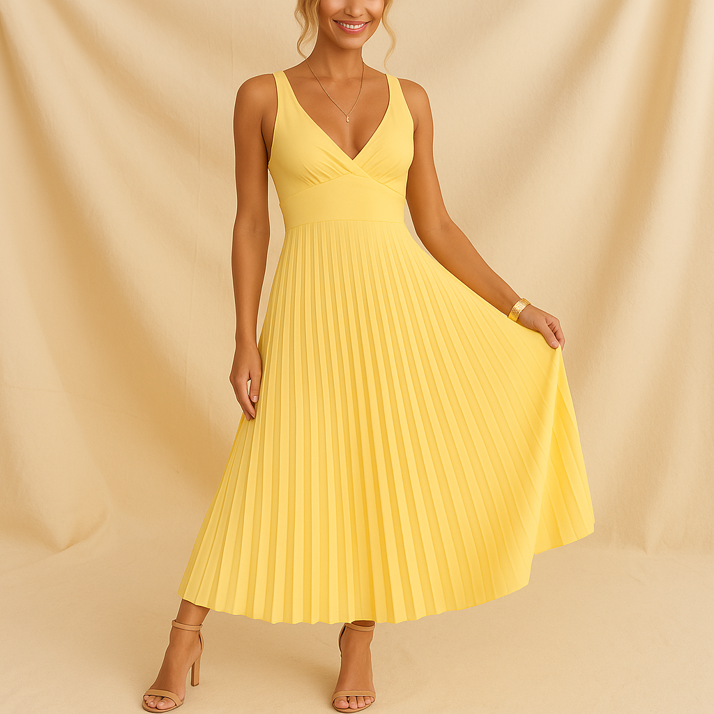 In een tint die de zomerzon evenaart, komt de Eszter-jurk tot leven bij elke beweging. Het subtiel geplooide rokdeel zweeft speels, terwijl de open rug en elegante schouderbandjes een bijzondere look creëren. Licht, vrouwelijk en verfijnd - deze jurk is de perfecte keuze als je op zoek bent naar iets echt bijzonders.