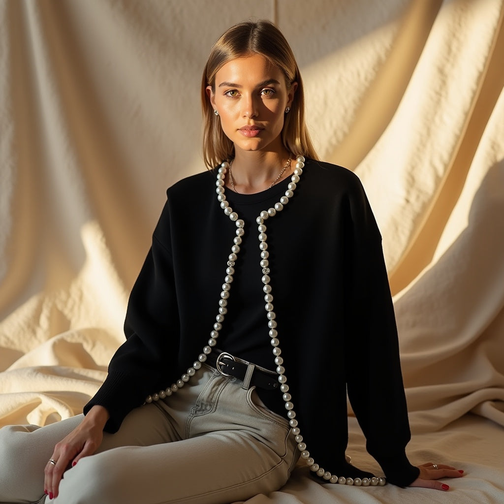 Geef je casual outfit een edgy touch met dit unieke cardigan met pareldetails. De combinatie van comfort en stijl maakt dit een must-have voor een moderne garderobe.