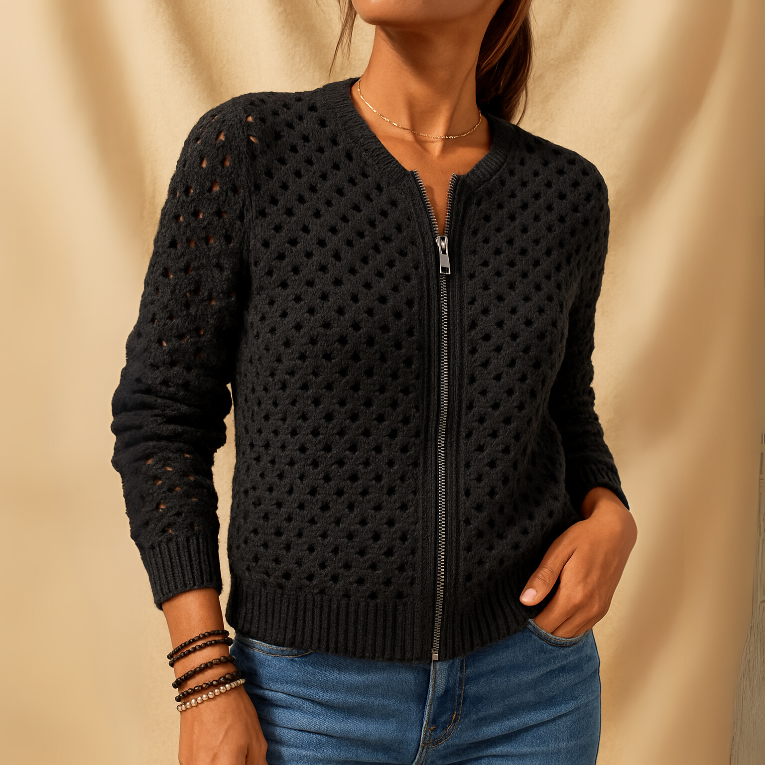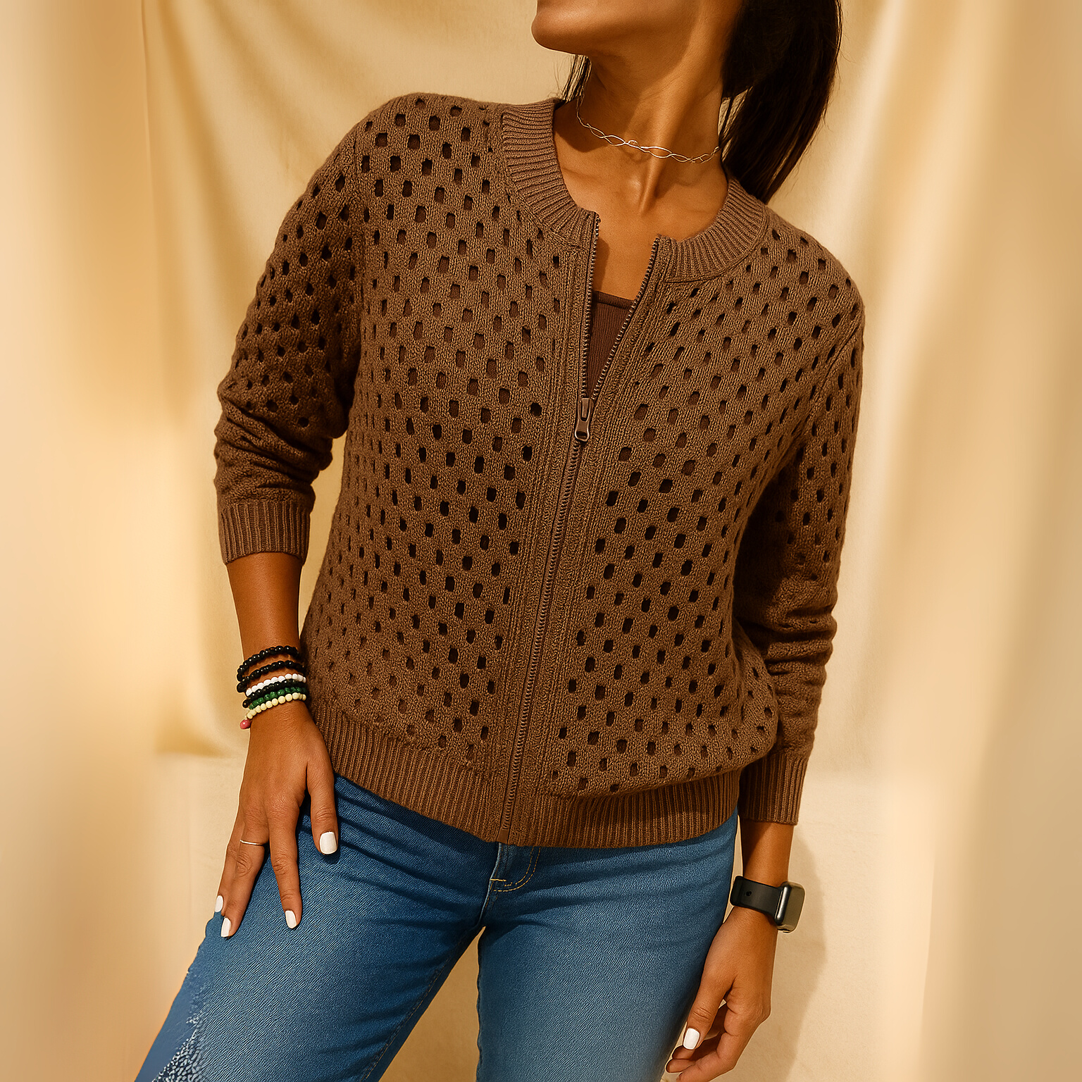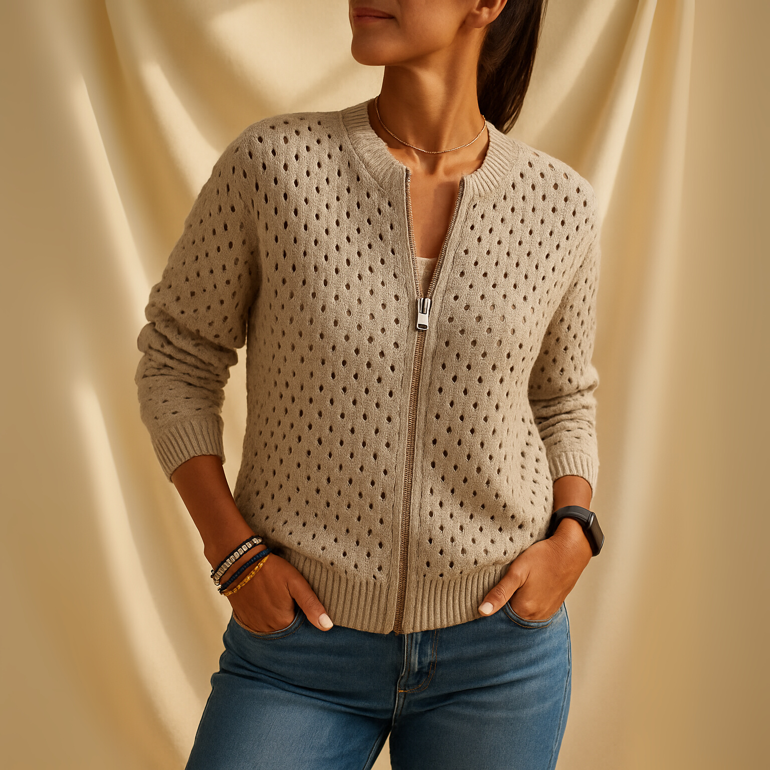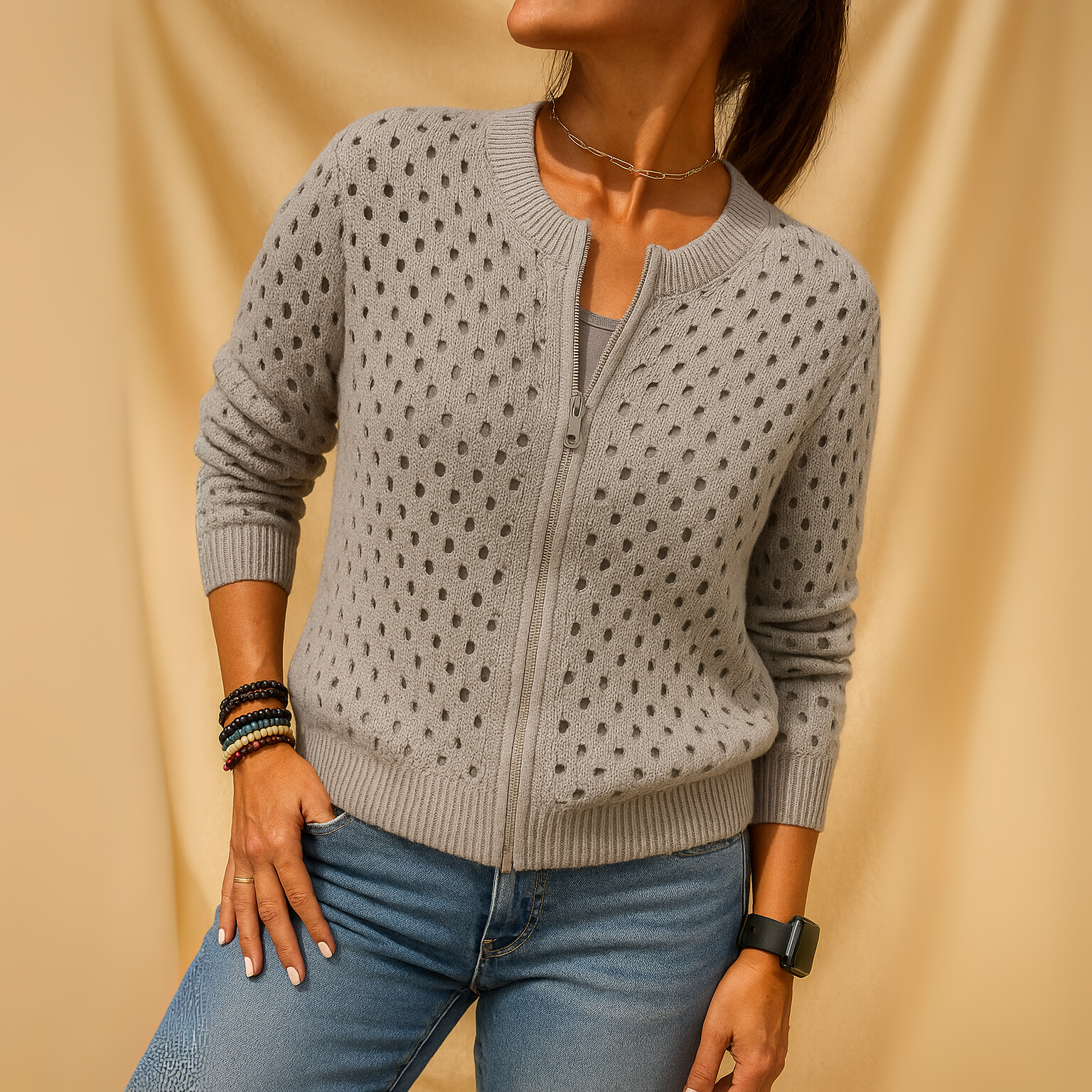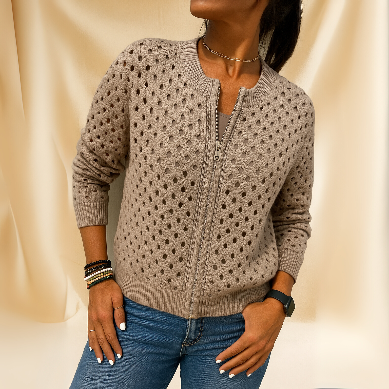 De Astrée trui combineert luchtige lichtheid met een sterke structuur. Met een losse weving en rits creëer je eenvoudig een opvallende én comfortabele look.