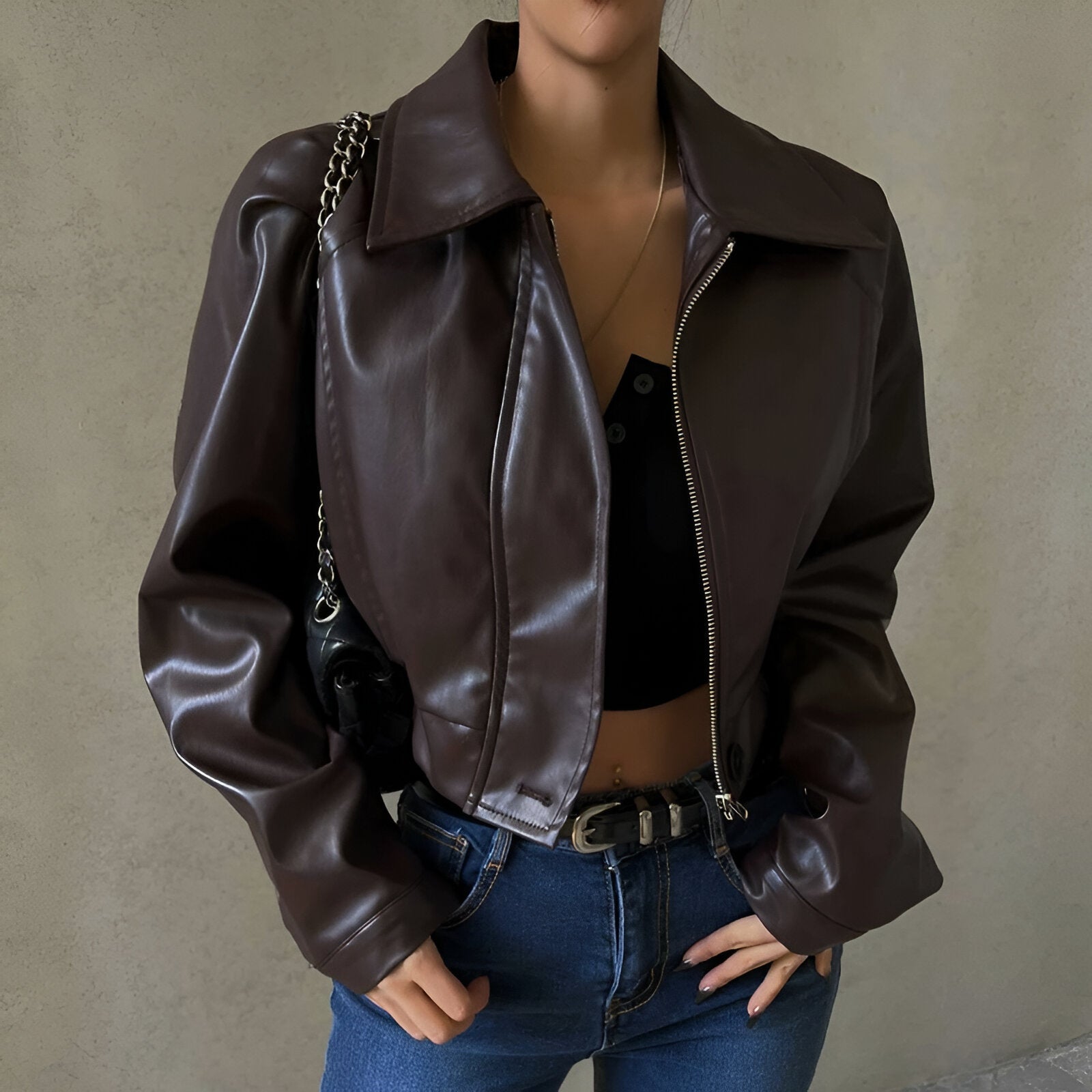 De Noelia leren herfstjas is een moderne klassieker met een stoere, luxe uitstraling. Het glanzende leer en de rechte snit geven dit ontwerp een krachtige look, terwijl de cropped lengte zorgt voor een eigentijdse en flatterende pasvorm.