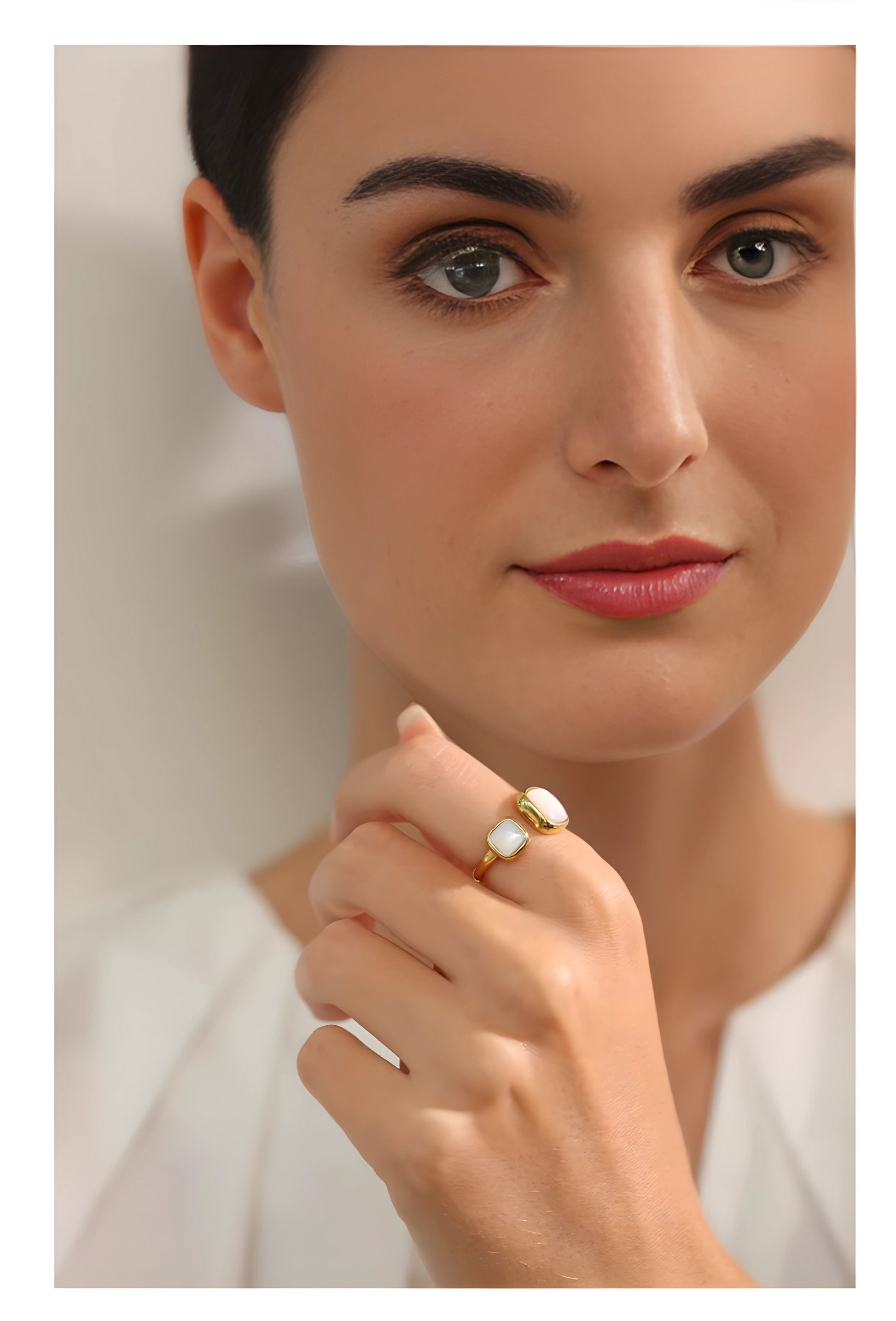 Twee sprankelende stenen maken deze ring verfijnd en elegant. Het moderne, verstelbare ontwerp maakt het een ingetogen maar toch opvallend sieraad voor dagelijks gebruik.